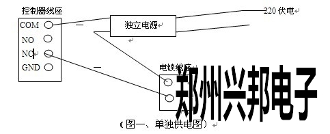 2、  鎖到控制器的連接線需采用2芯電源線,控制器到鎖距離不可以超過100米,線徑大于1.0 mm。如有需門磁檢測線則需多2芯線。(可根據(jù)現(xiàn)場需要定)。如果輸出12V電源有明顯降壓則可以微調(diào)電源電壓到13.6V或單獨(dú)給電鎖供電(如圖一)。