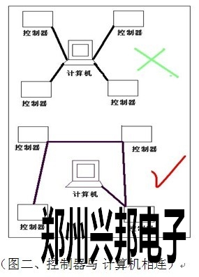 控制器GND 485- 485+分別對應(yīng)連接485轉(zhuǎn)換器GND TD(A) TD(B),通訊線路采用串聯(lián)掛接式連接,請勿采用星型連接或者局部星型連接(如圖二)。如果線路過長和設(shè)備過多,請?jiān)谧詈笠慌_(tái)設(shè)備上增加終端電阻(有跳線加載)總線最多可掛接128臺(tái)控制器。