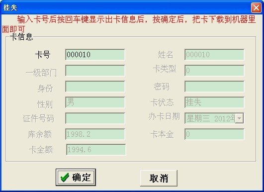 補(bǔ)卡操作的第一步:將丟失的卡進(jìn)行掛式,在軟件卡管理——卡掛失,輸入要掛失的卡號(hào),然后按回車鍵,出現(xiàn)卡的基本信息后,點(diǎn)擊確定鍵(如圖一)