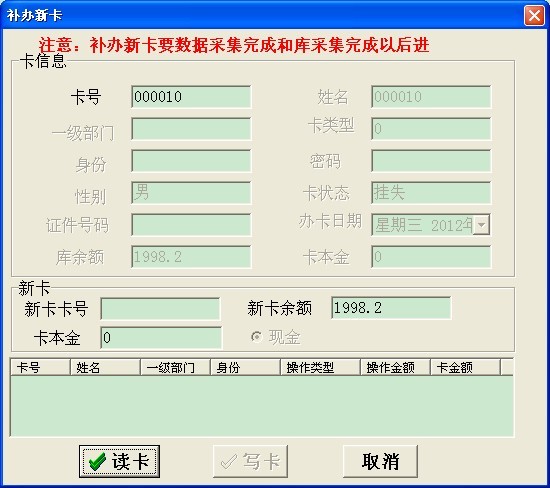 第三步:將一張未發(fā)行過的卡放到讀卡器上,在軟件卡管理——補(bǔ)辦新卡,在出現(xiàn)的界面中輸入要補(bǔ)辦的卡的卡號(hào),然后按回車鍵, 在出現(xiàn)丟失卡的卡信息后,點(diǎn)擊讀卡,寫卡,這張新卡就將原來的卡補(bǔ)辦了?。ㄈ鐖D二)