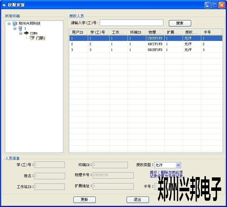 1.選擇終端,在右列表框中可顯示出該終端下的所有授權(quán)人員的名單?;蛘咴谡?qǐng)輸入學(xué)(工)號(hào)右邊的文本框中錄入所要更改權(quán)限的學(xué)工號(hào),單擊搜索按鈕可在列表中查詢出該人員的授權(quán)信息。
