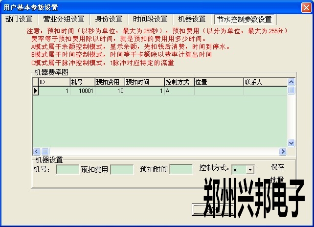 雙擊要修改水控費率的機器號,在機器設置中會出現(xiàn)機器的基本信息。輸入預扣費用及預扣時間,選擇控制方式后單擊【保存】按鈕即可。每更改一次費率都要下載一下水控機基本參數(shù)。