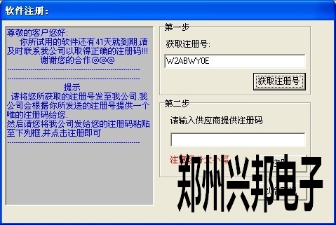 軟件安裝完成后有一個月的試用期,當(dāng)過了試用期后軟件就打不開了,所以在試用期結(jié)束前就要注冊軟件,軟件注冊時首先在軟件的幫助-軟件注冊中獲取一個注冊號,如下圖所示,把獲取到的注冊號發(fā)到公司,公司會提供一個注冊碼,把注冊碼復(fù)雜粘貼到第二步的注冊碼中,點(diǎn)擊注冊就可以了。如果軟件已經(jīng)過期獲取不到注冊號,那么就要通過一個小插件獲取注冊號,在插件上進(jìn)行注冊就可以了。