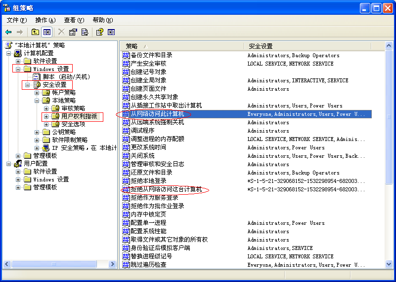 2.打開(kāi) 組策略-計(jì)算機(jī)配置-windows設(shè)置-安全設(shè)置-本地策略-用戶(hù)權(quán)利指派中,將Guest賬戶(hù)添加到從網(wǎng)絡(luò)訪(fǎng)問(wèn)計(jì)算機(jī),拒絕從網(wǎng)絡(luò)訪(fǎng)問(wèn)這臺(tái)計(jì)算機(jī)中將Guest賬戶(hù)刪除