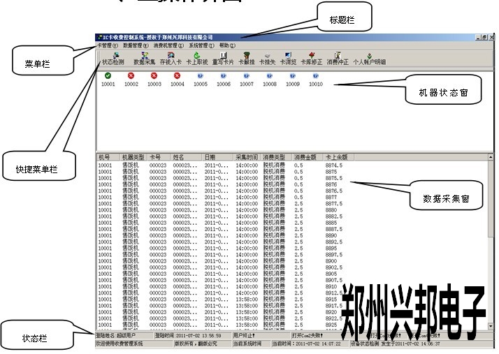 4)數(shù)據(jù)采集窗口用于查看數(shù)據(jù)的采集情況,在進(jìn)行消費(fèi)的時候,最好不要對收費(fèi)機(jī)進(jìn)行數(shù)據(jù)采集,我們不建議邊消費(fèi)邊采集數(shù)據(jù)