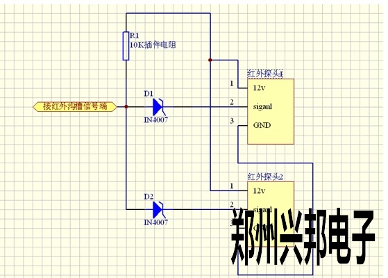 將每個(gè)二極管(IN4007)的負(fù)極和對應(yīng)的探頭信號(hào)端相連之后,再將每個(gè)二極管(IN4007)的正極擰到一起再與紅外溝槽的信號(hào)端相連。