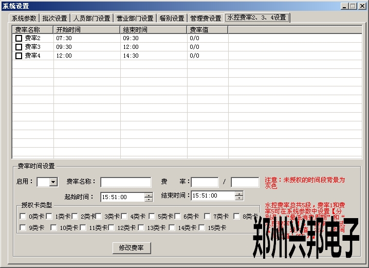 2、設(shè)置幾點(diǎn)到幾點(diǎn)之音流多長(zhǎng)時(shí)間扣多少錢,在管理中心-系統(tǒng)設(shè)置-水控費(fèi)率2、3、4設(shè)置里面設(shè)置時(shí)間,費(fèi)率。