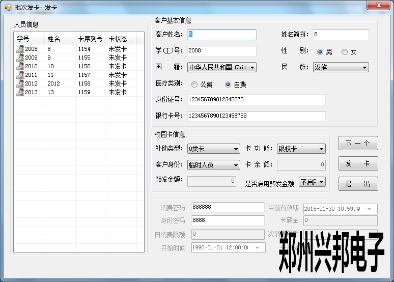 信息發(fā)卡需要在信息設(shè)置中將基本信息錄入,可以連續(xù)錄入多條信息。然后在空白處右鍵點擊信息發(fā)卡,按學(xué)號或者姓名查詢未發(fā)卡的信息直接雙擊,選擇輸入預(yù)發(fā)金額將卡片放于讀卡器上直接點擊發(fā)卡即可;也可以直接選擇未發(fā)卡的信息右鍵選擇信息發(fā)卡進(jìn)行發(fā)卡。