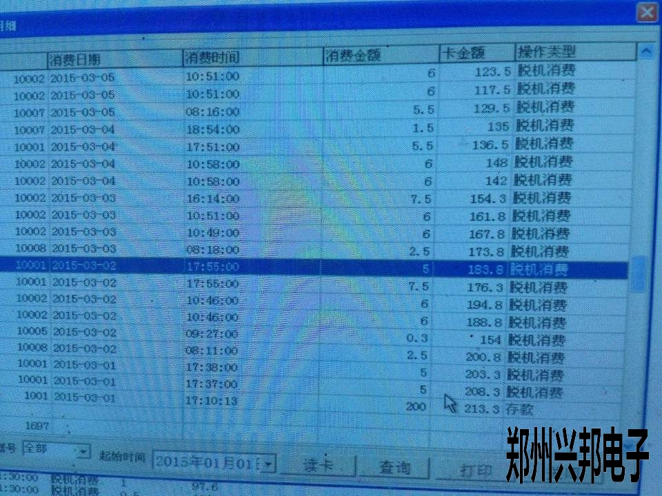 讓客戶在軟件里面查看一下個(gè)人明細(xì)表,選擇這張卡從開卡到現(xiàn)在的時(shí)間段,從下往上看,因采集的時(shí)候只顯示到分,沒有顯示到秒,所以看數(shù)據(jù)的時(shí)候要在同一日期的往上看一下,有的是沒有按順序排列的。像圖上所示的,所選擇的這一列應(yīng)該是比下面的這一列先消費(fèi)的。還有一條是10005號(hào)的對(duì)不上,5號(hào)機(jī)應(yīng)該是時(shí)間錯(cuò)誤了,這條應(yīng)該是3月3 號(hào)的消費(fèi)數(shù)據(jù)。把5號(hào)機(jī)校一下時(shí),下載一下參數(shù)就可以了。這種問題就解決了。