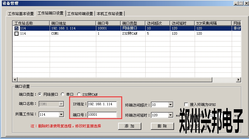 軟件中在工作站端口設置中,端口類型要選擇‘網(wǎng)絡接口’,IP地址一欄要輸入本機電腦的IP地址(不是消費機的IP地址),端口號一欄要輸入配置模塊IP時設置的遠程端口號,如下圖所示,然后點擊添加即可