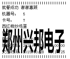 計(jì)算模式下按‘+’號(hào)鍵可進(jìn)行取餐,取餐時(shí)將需要取餐的卡放到刷卡區(qū),消費(fèi)機(jī)可自動(dòng)讀取卡片上的訂餐信息,并將其顯示出來,按‘+’號(hào)鍵可翻頁查看訂餐信息,按‘確認(rèn)’可進(jìn)行取餐,取餐成功后會(huì)顯示就餐成功、菜肴名稱、份數(shù)、扣費(fèi)金額,若連接的有打印機(jī),可打印取餐信息,打印的格式如下圖所示: