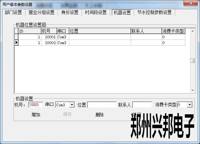 在機器設(shè)置中可以添加機器,設(shè)置機器號、串口以及消費卡類型,位置、聯(lián)系人可以選填。其中設(shè)置機器號必須輸入5位,開頭為1,最大可設(shè)置為19999.串口是指通訊器連接電腦的端口號,此處的串口號選擇不正確的話會導(dǎo)致機器不通訊。