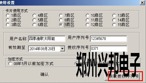 2.雙擊后出現(xiàn)下圖所示的界面,點(diǎn)擊該界面右下角的【獲取授權(quán)序列號(hào)】按鈕,即可讀出當(dāng)前數(shù)據(jù)庫(kù)中的設(shè)置,包括 使用扇區(qū)、用戶名稱(chēng)、用戶序列號(hào)、授權(quán)序列號(hào)、加密方式
