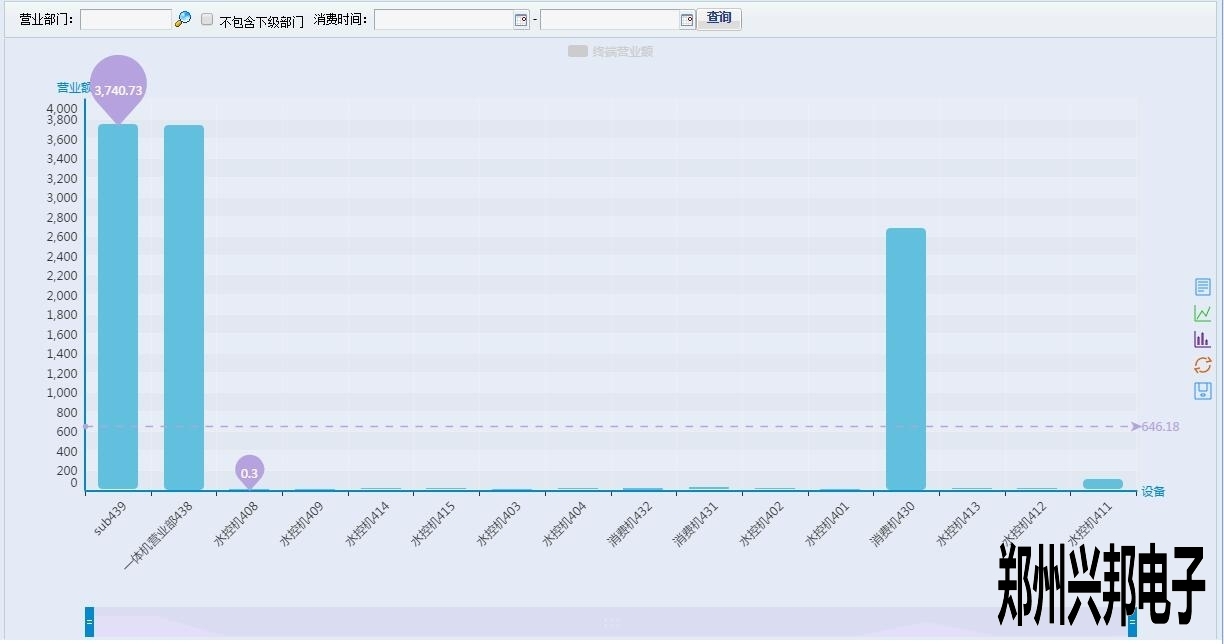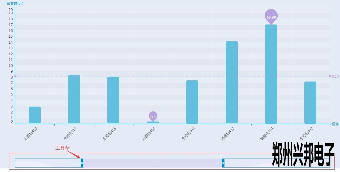這是一個柱狀的數(shù)據(jù)圖表,展示了各個終端在所查詢時間內(nèi)的營業(yè)情況,那么最下面的那條橫杠是什么呢?其實(shí)那是一個工具條,用來集中顯示某個具體的柱狀數(shù)據(jù),如水控機(jī)409以及后面的幾個數(shù)據(jù)都看不大清楚,想要拉近一點(diǎn)看看,怎么做呢,很簡單,只要拉動最下面的工具條就好了,就像這樣: