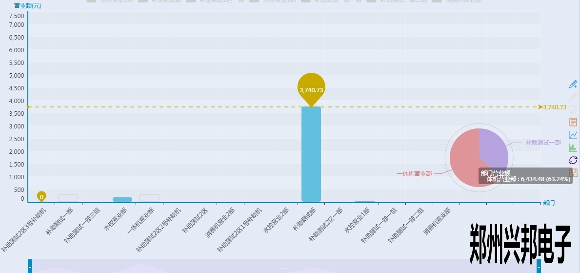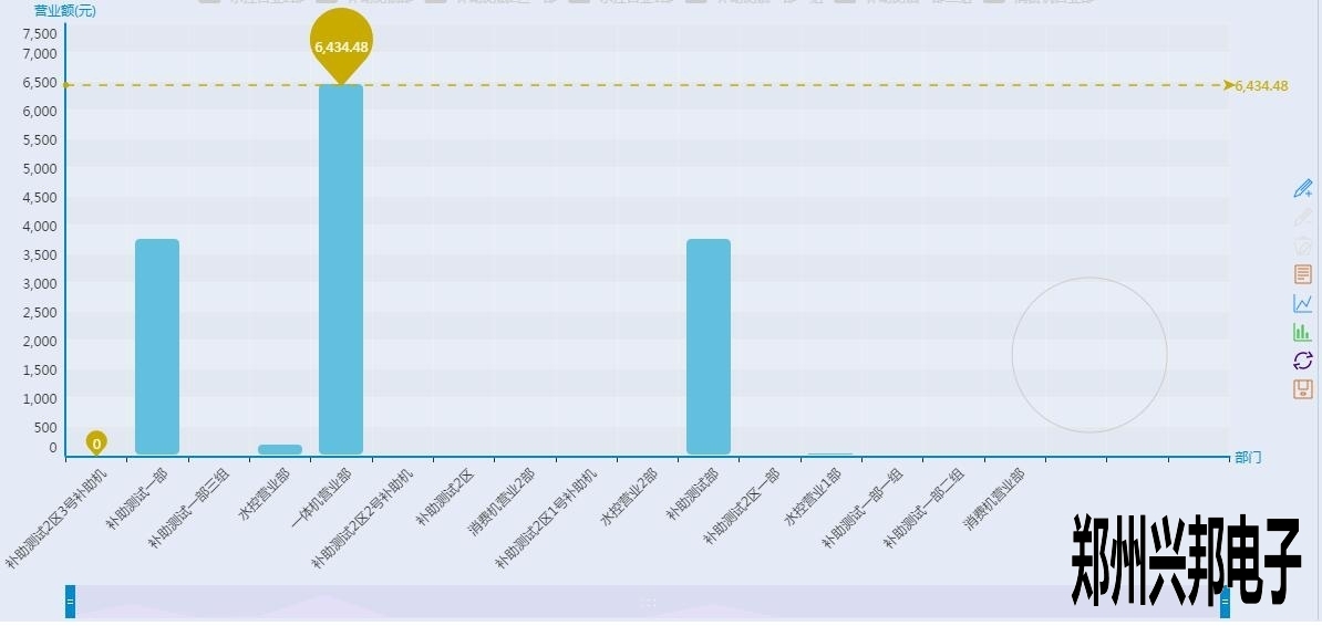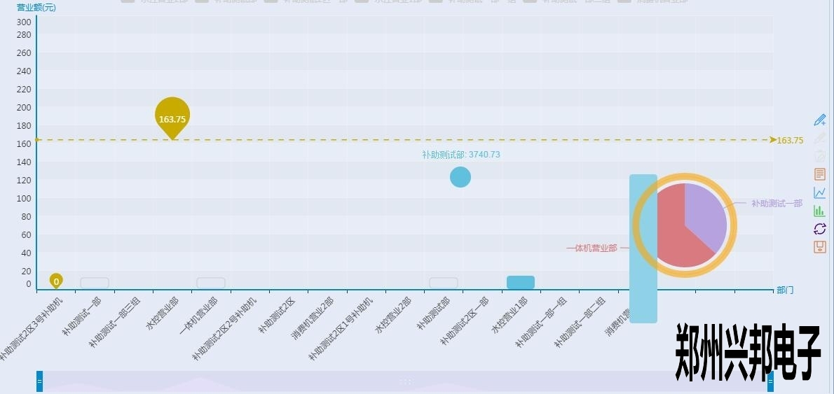 看上起跟終端營業(yè)圖表差不多,但是有沒有注意到有一根和終端營業(yè)分析圖不一樣樣色的虛線?這是這個(gè)圖表里面的最大值,也就是營業(yè)額最高的部門,當(dāng)然下面的工具條也可以像終端營業(yè)分析圖一樣的滑動(dòng)來看某個(gè)具體的柱圖,不過你又沒有注意到后面還有一個(gè)圈?對(duì)那是一個(gè)圈圈,有什么用呢?來看一下下面的圖形: