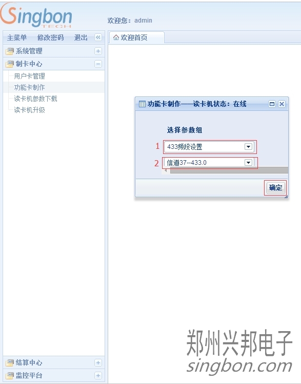 在上圖中,方框1處參數(shù)組選擇“433頻段設(shè)置”,方框2處是供用戶選擇的信道,用戶選擇好需要使用的信道后,在綁定的讀卡機上放一張相同參數(shù)未發(fā)行的卡片,點擊“確定”按鈕后功能卡制作成功。用制作好的功能卡在機器的刷卡處刷卡,從而修改機器的信道。