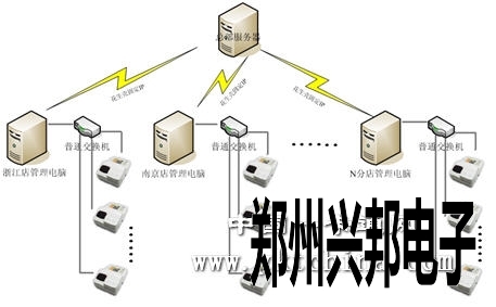 如上圖所示,整個系統(tǒng)的管理電腦單獨存在,在剛開始建設時就把各個分店的電腦數(shù)據(jù)庫單獨建立,制作卡片時,通過卡片的號碼段位來區(qū)分各店的范圍,只是在需要傳輸數(shù)據(jù)時,通過花生殼軟件等工具綁定IP地址,使各家分店和總部服務器之間的通訊無地理的局限,實現(xiàn)整個系統(tǒng)數(shù)據(jù)的實時交換。