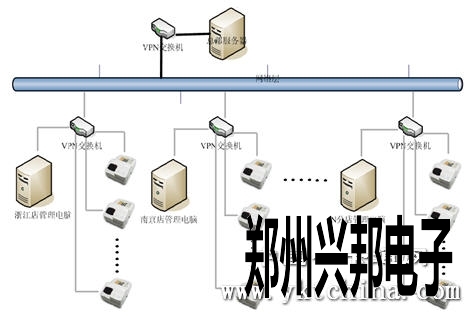 如上圖所示,把整個系統(tǒng)的管理電腦納入到VPN局域網(wǎng)絡中來,使各家分店和總部服務器之間的通訊無地理的局限,實現(xiàn)整個系統(tǒng)數(shù)據(jù)的實時交換。